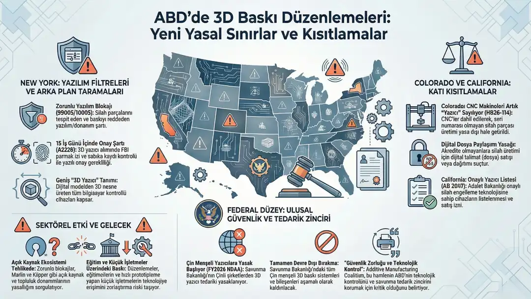 ABD’de özellikle bazı eyaletler, 3D yazıcıların kullanımına yönelik oldukça katı kurallar getirmeye hazırlanıyor. Bu düzenlemeler, sadece üreticileri değil; öğrencilerden girişimcilere kadar geniş bir kullanıcı kitlesini doğrudan etkileyebilir.