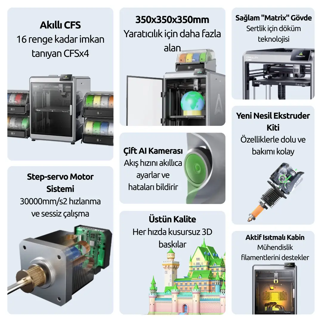 K2 Plus Combo’nun en ayırt edici özelliklerinden biri, Creality’nin CFS (Color Filament System) çok renkli baskı ünitesiyle birlikte sunulmasıdır.