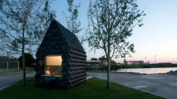 Özelliği: Geri dönüştürülebilir biyo-plastik malzemelerle FDM teknolojisi kullanılarak üretilmiştir. İçinde yatağa dönüşen bir kanepe ve dışında bir küvet bile bulunur.