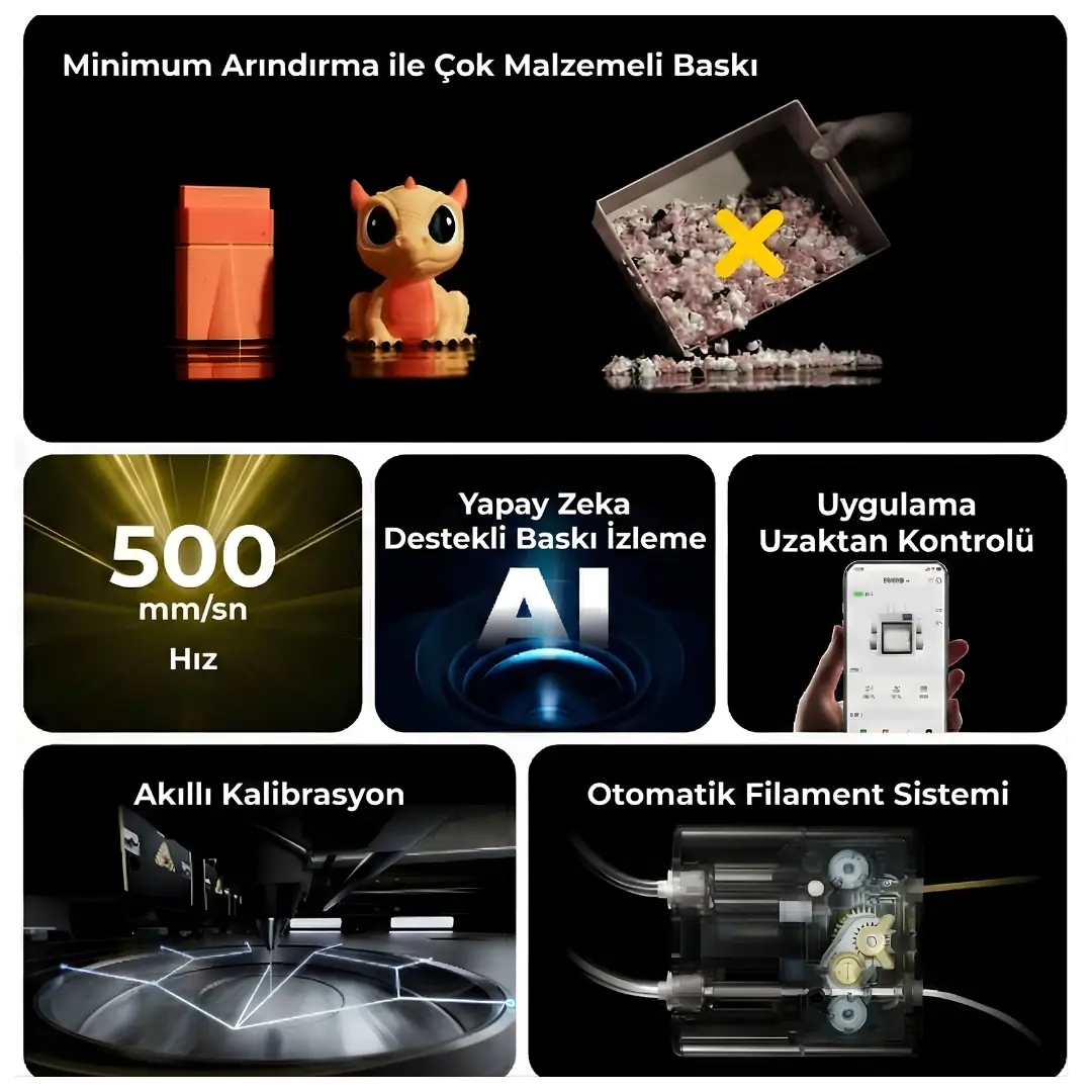 Eğer mevcut popüler sistemlerden birini kullanıyorsanız bilirsiniz; 100 gramlık renkli bir figür basmak için bazen 200 gram filamenti çöp kutusuna atarsınız. Snapmaker U1, filamentin %100'ünü modele gönderir. Daha da önemlisi, U1 sadece "çok renkli" değil, tam anlamıyla "çok malzemeli" (Multi-Material) bir cihazdır. Esnek bir telefon kılıfının arkasına sert plastikten bir stand eklemek veya hareketli mekanik parçaları birbirine yapışmasın diye suda çözünen PVA desteğiyle basmak, U1'in rakipsiz olduğu alanlardır.