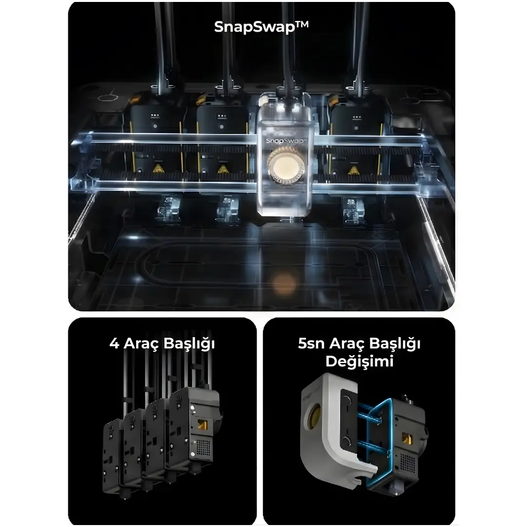 Snapmaker, kısa süre önce piyasaya sürdüğü yeni Snapmaker U1 modeli ile bu sorunu kökünden çözmeyi hedefliyor. Tek bir nozülün içine sürekli farklı renkler itip çıkarmak yerine, oyunun kurallarını tamamen değiştiren bir teknoloji ile karşımızdalar: SnapSwap™ Toolchanger (Çoklu Kafa Değiştirici) sistemi.